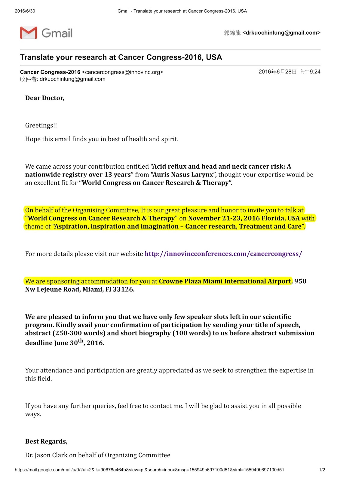 Congress on Cancer Research & Therapy),這場會議將於今年11月在美國佛羅里達邁阿密舉行。大會對於我近期發表全球首篇研究「胃食道逆流」與「頭頸部癌症」關係的流行病學相當感興趣(連結),希望我以此發表一場演講,還贊助會議期間的所有飯店住宿經費。不過今年九月即將前往美國聖地牙哥參加美國耳鼻喉科醫學年會並發表演說(感謝台灣之光國泰醫院黃子晉主任邀約,給我這個難得的機會,連結),別說體力耗盡,錢袋也會耗光,只好委婉拒絕邀約,實在可惜。